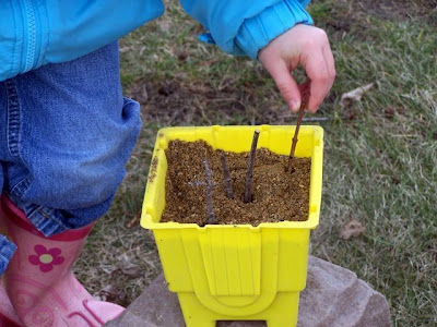 It was nice enough outside on Tuesday to play at the sandbox awhile, although since it was kinda damp in there, she played from the outside of it. I love that she wanted to make me a cake. :) Here's some of the process. Yep, she even consulted Boots for some ideas.