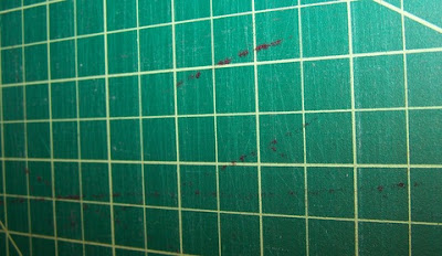 Here's the best shot I could get of some fibers from fabric I've recently cut, stuck in my cutting mat. I've previously found fuzzy fibers, particularly from cutting fleece or batting, a real pain to get out.
